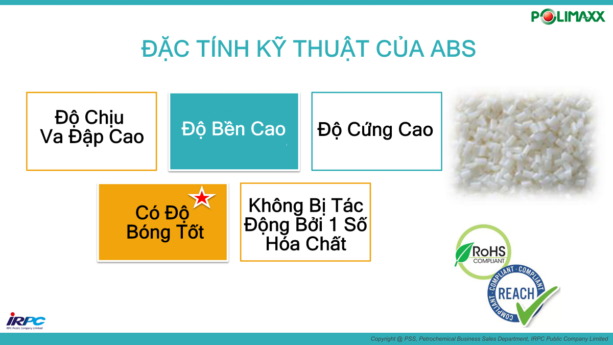 Chất liệu ABS là một loại nhựa kỹ thuật được làm từ nhựa copolymer Acrylonitrile Butadiene Styrene, ABS có tính chất vật lý cân bằng tốt giữa độ cứng, độ bền cao, chịu va đập tốt, chống nhiệt và chống hóa chất cao, cứng và bóng.