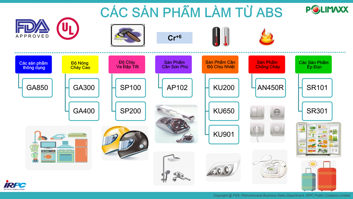ABS là chất liệu nhựa chủ yếu được sử dụng làm ra các bộ phận điện tử, đồ gia dụng, ô tô, đồ chơi và các ngành công nghiệp khác.