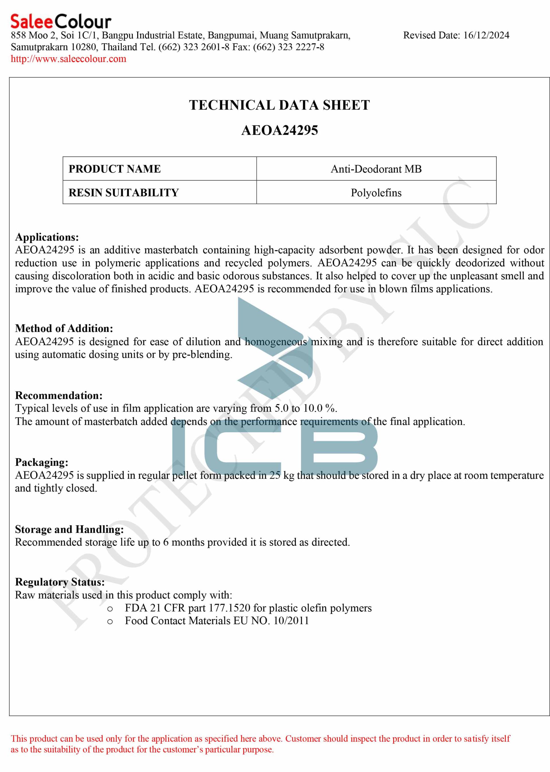 Hạt khử mùi AEOA24295 nguồn gốc Thái Lan, sản xuất bởi công ty Salee Colour dùng để khử mùi khi tạo ra các thành phẩm nhựa ứng dụng màng thổi đảm bảo không gây mùi hôi khó chịu, cụ thể là các loại túi đựng như: