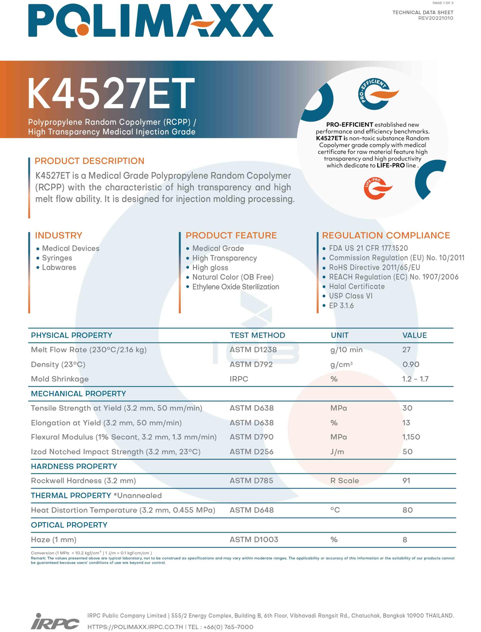 Thông số kỹ thuật Hạt nhựa PP Copolymer K4527ET (TDS)